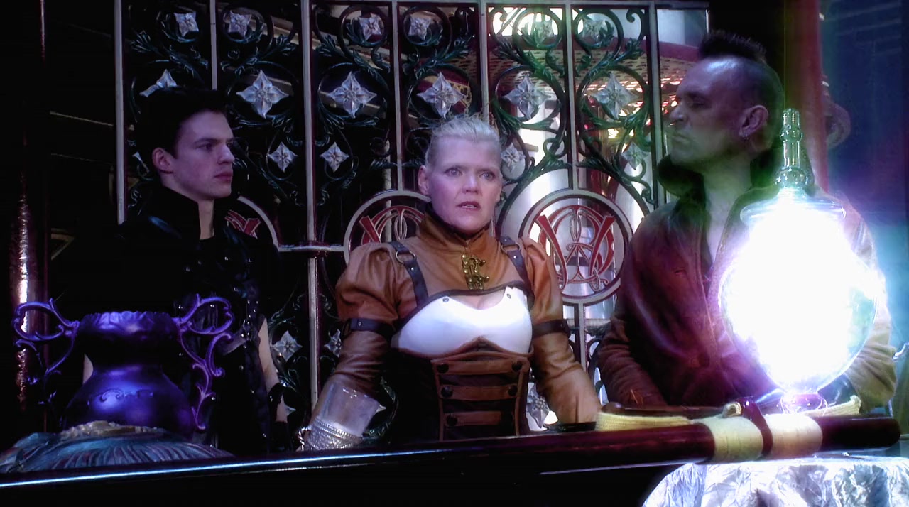 The galaxy trembles under the tyrannical rule of the Visray empire. The planet Sarnia is “under seige” (no, really). Azura (Trudie Tume) is taken captive by the invading forces. Twelve years pass, and Azura (Cecily Fay) has escaped the clutches of her captors and now hides on the mining planet of Draiga 5. There she survives by staying out of sight. One day Azura is discovered and imprisoned by Visray patrols. She’s sold to slavetrader Sef (John Robb, as Jon Robb) and is forced into gladiatorial combat for the amusement of Section Commander Sorrentine (Joelle Simpson). Sorrentine is grooming her son Peltarion (Daniel Everitt-Lock) as a successor. The catacombs are overflowing with rebellion and the headforce – the brave Viridian (Cheryl Burniston), the feisty Amber (Yennis Cheung), and pricefighter Dahlia (Lauren Okadigbo) – have managed to plant a deep undercover operative in the court with Kewan (Michael Collin). Before long Azura is deemed recuperated enough for gladiatorial combat. It’s at this juncture that Kewan hands her an arcane tome from which she learns ancient martial arts.