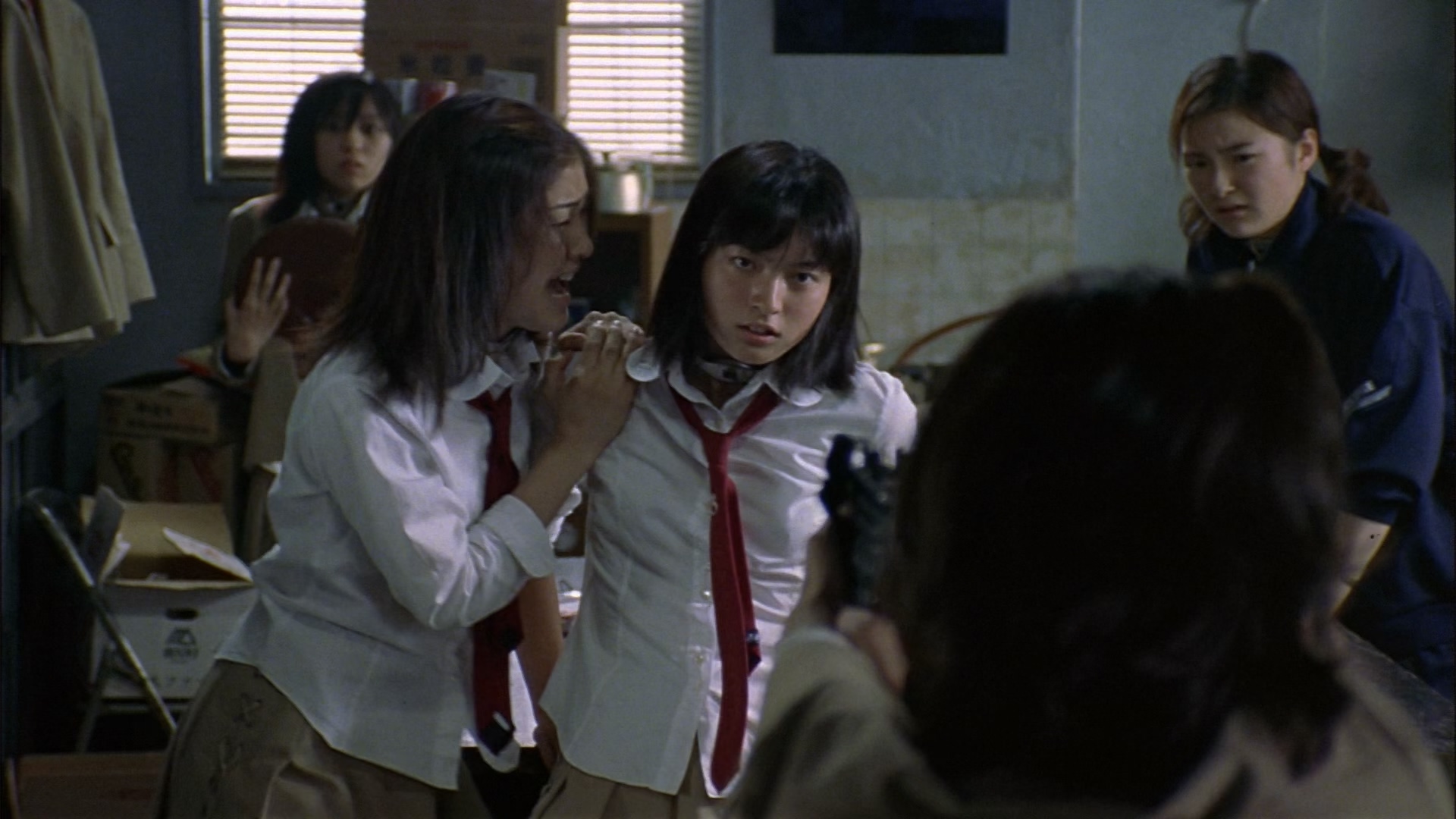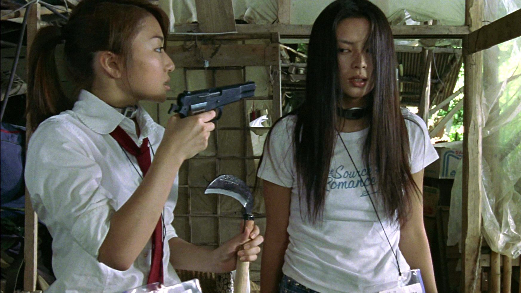 At the lighthouse Yukie Utsumi (Eri Ishikawa) has improvised a make-shift commune where she lives together with Satomi Noda (Sayaka Kamiya), cook Chisato Matsui (Asami Kanai), Yûka Nakagawa (Satomi Hanamura), Haruka Tanizawa (Satomi Ishii), and Yûko Sakaki. In a moment of youthful exhiliration she confesses her love for Shuya, which leaves him confused. The girls are resigned to their fate that their days are numbered but tensions run high regardless as they are consumed by paranoia and paralyzing, mind-killing fear. Yûko holds a vial of potassium cyanide with which she intends to poison Shuya for killing Ôki. When Yûka ends up gorging on a plate meant for Shuya and bloodily dies it finally drives Satomi, already half-mad with terror, over the edge who empties her Mini Uzi killing all the girls except for Yûko who was able to find shelter. Shuya witnesses only the bloody aftermath and Yûko killing herself. As the game draws to an end Mitsuko and Kiriyama turn on each other, the Third Man launch their attack and Sigimura at last finds Kotôhiki after a three-day expedition. In the classroom where they started Shuya confronts Kitano-sensei and Shuya and Noriko escape the island as convicts. In the city Noriko obtains a switchblade, and now that they’re both armed they’re ready to take on their repressive government.