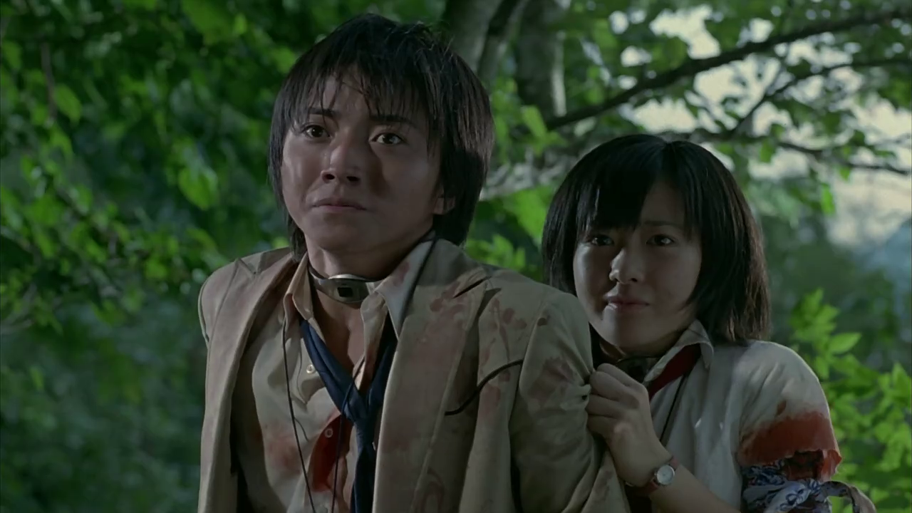 At the dawn of the millennium Japanese society collapsed. A deep recession put 15% or some 10 million people out of work, and 800,000 students boycotted the schools. The youth, unruly and delinquent, was out of control and fearful parents were driven to desperation. In fear of a civil uprising if nothing was done to remedy the quickly escalating situation Japan’s fascist, totalitarian regime passed the Millennium Educational Reform Act, otherwise known as Battle Royale. The Battle Royale is an annual televised event to instill fear of the government into the citizenry and quell any dissidence. A busload of students of Kurasu 3B of Shiroiwa Junior High School from the fictional Kagawa Prefecture town of Shiroiwa are en route to what they believe is a field trip. Orphan Shūya Nanahara (Tatsuya Fujiwara), his best friend and fellow orphan Yôshitoki Kuninobu (Yukihiro Kotani) as well as the privileged and sheltered but otherwise innocent Noriko Nakagawa (Aki Maeda) and her best friend Megumi Etô (Sayaka Ikeda) are jittering with excitement. They are gassed and driven to a remote location surrounded by military checkpoints. Then everything went black…