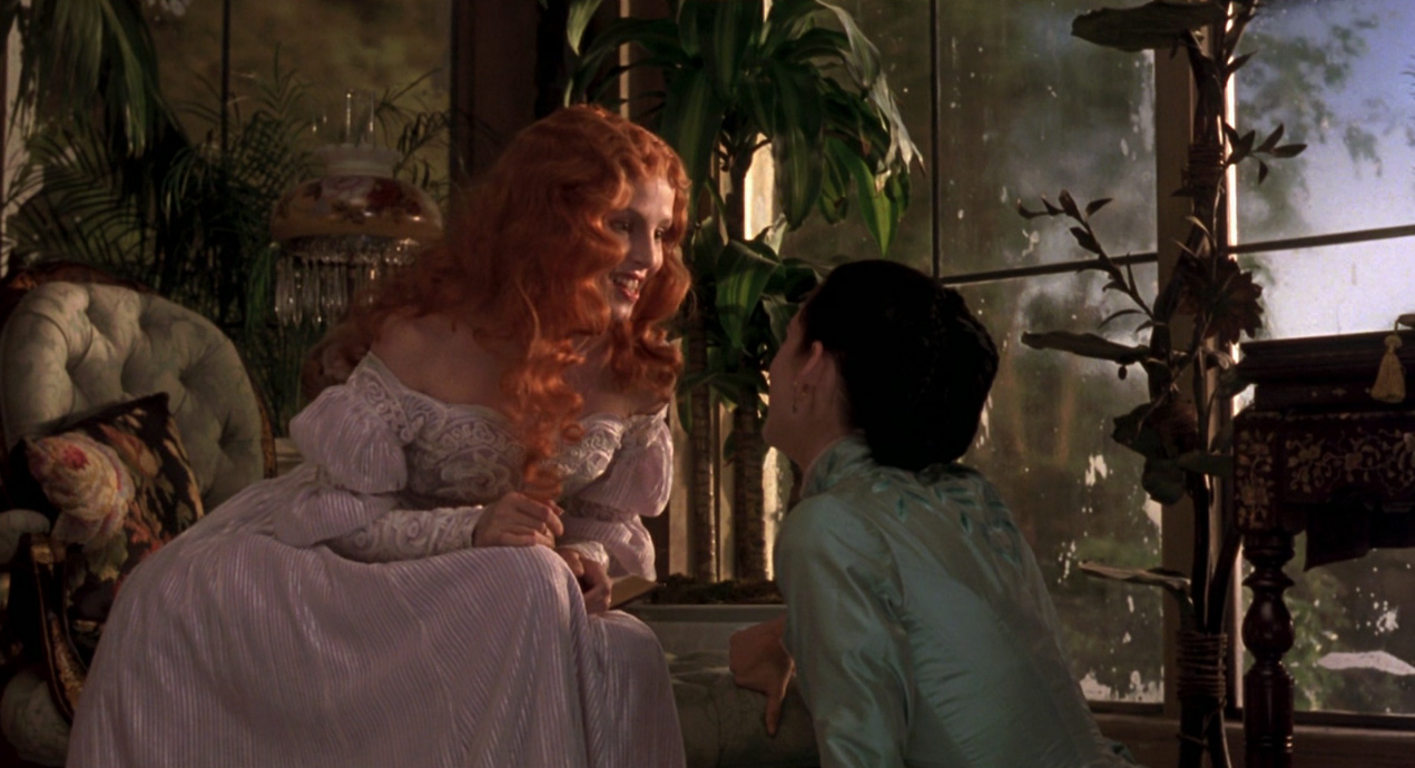 If anything, Dracula is a love letter to primitivism as Coppola staunchly insisted on the usage of in-camera practical effects. Dracula leaned heavily on foamlatex appliances that were revolutionizing monster make-up at that time, and some old-fashioned visual trickery and movie magic (miniature models, forced perspective, stationary matting, conventional animation, et al) to realize his grand vision. Costume designer Eiko Ishioka was ordered to make the wardrobe Oriental which she, understandably, interpreted as meaning East Asian and not Byzantine. Where else are you going to see an ancient, pallid, parchment-skinned Dracula in a red silk kimono with a train as long as any bridal dress and a hairstyle resembling that of an Edo courtesan complete with two-feet Manchu pigtail? Where else are you going to see castle Dracula in the shape of a man sitting on a throne and the man himself desecrating a lascivious, partially disrobed, maiden in wolven form with all the lust and vigor out of a Paul Naschy El Hombre Lobo episode?