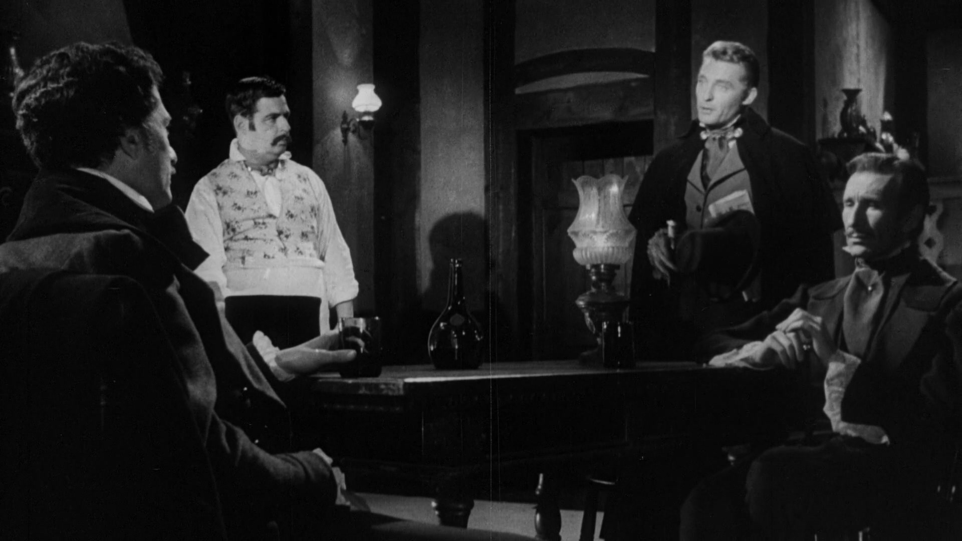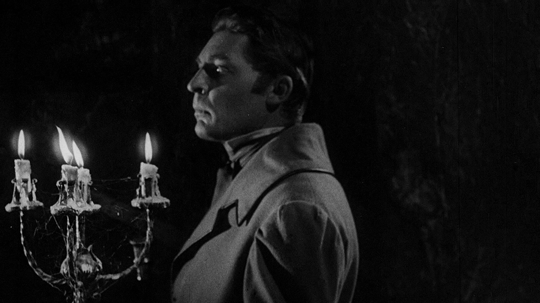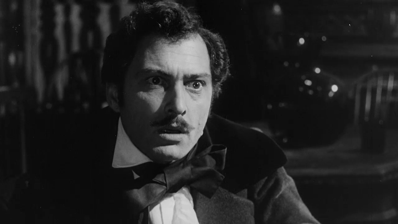 In the gloomy Four Devils pub in Victorian era London vacationing American author of weird and macabre literature Edgar Allan Poe (Silvano Tranquilli, as Montgomery Glenn) is reciting his 1835 novel “Berenice” to his companion Lord Thomas Blackwood (Umberto Raho, as Raul H. Newman). Intersecting with the men is starving young journalist Alan Foster (Georges Rivière) who has been trying to secure an interview with Poe. Poe insists that all of his stories were based on events he experienced. The men discuss the nature of death and Foster explains his skepticism towards the supernatural. At this juncture Lord Blackwood proposes Foster put his skepticism to the test by staying the night at his remote castle. An easy enough wager that will score him 100 pound sterling for his trouble. Foster accepts the challenge, offering ten pound sterling as collateral and soon he is being transported to the fog-enshrouded manor by coachman Lester (Salvo Randone) in Lord Blackwood’s carriage. After passing through the huge iron gate, traversing a foggy graveyard and navigating through thick foliage and long tree limbs Foster, sufficiently spooked, makes his way into the Castle Of Blood.