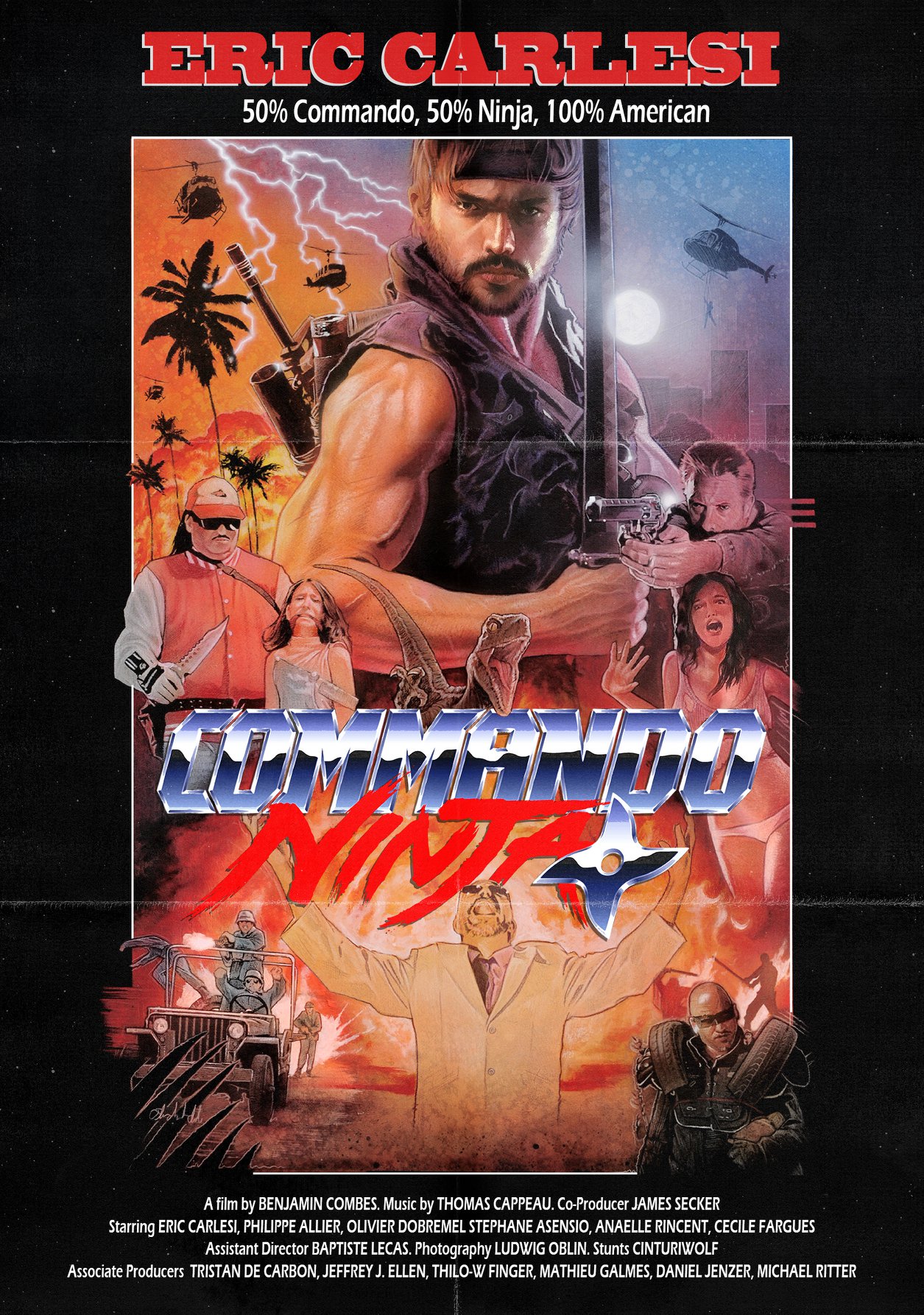 French indie filmmaker Benjamin Combes has virtually done the impossible. On an estimated budget of a modest €35,000 Combes has created the ultimate and definite throwback to 80s action. Not only is Commando Ninja a loving tribute to the most memorable movies from Arnold Schwarzenegger, Sylvester Stallone, and Jean-Claude Van Damme; it also shows what that much pined after collaboration between Cirio H. Santiago, Godfrey Ho, Andy Sidaris, and early Peter Jackson that the world never got could have looked like. In a brisk 70 minutes Commando Ninja pays homage to everything from 80s American action movies from Cannon, Hong Kong ninja movies, Italian - and Thai Vietnam war movies, and even Filipino post-nuke actioners. There’s dinosaurs on the loose and Combes doesn’t shy away from showing tanned babes in candy-colored bikinis and a few jiggling breasts that would make the late Andy Sidaris and even Jim Wynorski proud. Commando Ninja doesn’t just have one of these things, it has them all… and then some. How come nobody is talking about the coolest independent action movie of 2018?