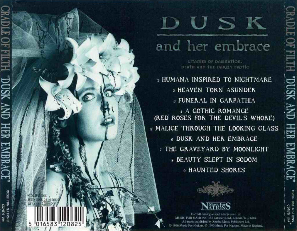 “Dusk… and Her Embrace” is a loose concept album about vampyrism. The lyrics were inspired by the literature of Sheridan Le Fanu, in particular the “Carmilla” novel (which served as an inspiration to everybody from Jess Franco Manera to Ann Rice). The subtitle ‘Litanies of Damnation, Death and the Darkly Erotic’ concisely summarizes the lyrical content of the album. The lyrics retain part of the anti-Christian sentiment but the focus squarely lies on the erotica, vampirism and romance from this point forward. It was the recording debut of second guitarist John Piras (Gian Pyres) and the one but last record to feature vocal contributions from early backing singer Danielle Cneajna Cottington. "Dusk... and Her Embrace" was the last Cradle Of Filth album before Davey's overt usage of British humor and self-aware puns, linguistic and otherwise.