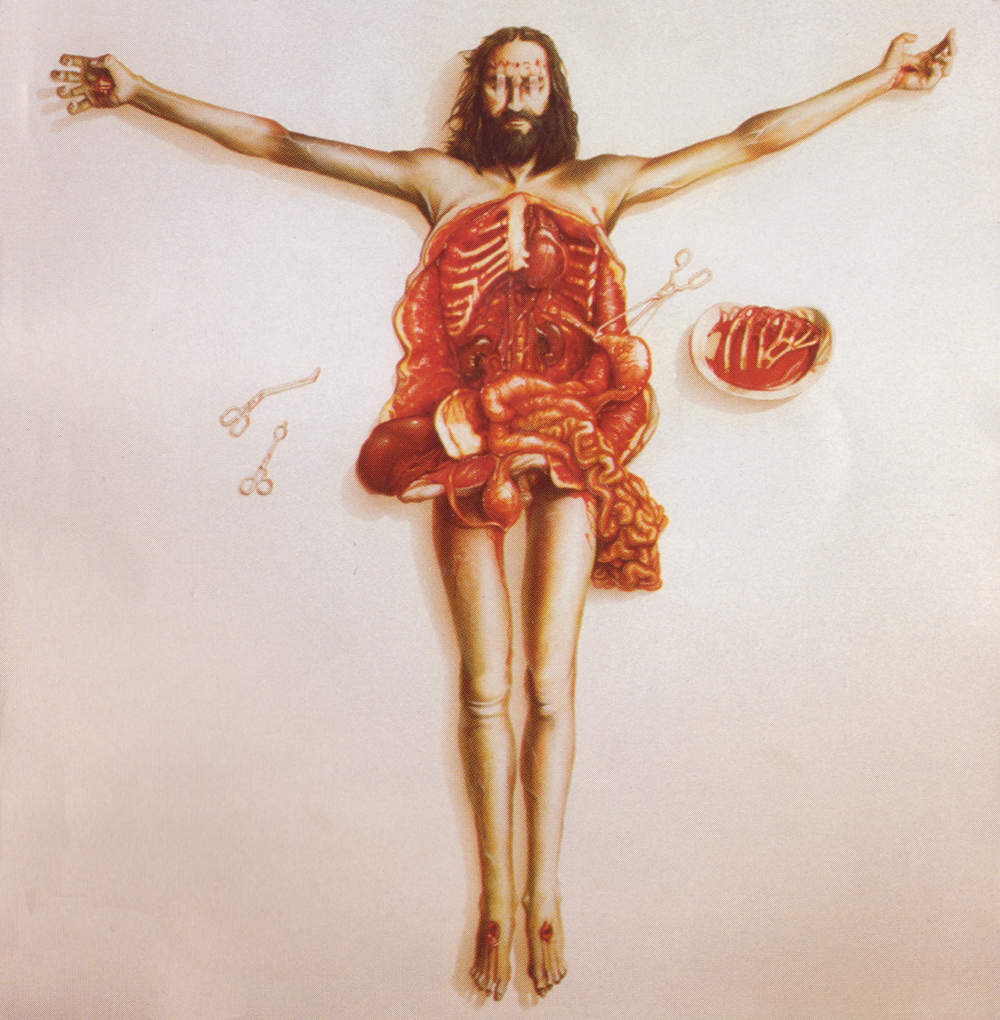 The intended artwork, in its uncensored form, can thankfully still be found in the booklet. While often described as an autopsy on the body of Christ (due to the presence of certain medical equipment), a closer glance reveals that it actually depicts a disembowelment. The revised artwork was inspired by the Shroud of Turin. The stains on the sheet shatter the illusion of the messiah’s transcendence. He is only human, this Christ figure, mortal and of mere flesh and blood, as his disciples. Due to the uproar over the blasphemous artwork the album managed to land at number 66 in the national British charts.