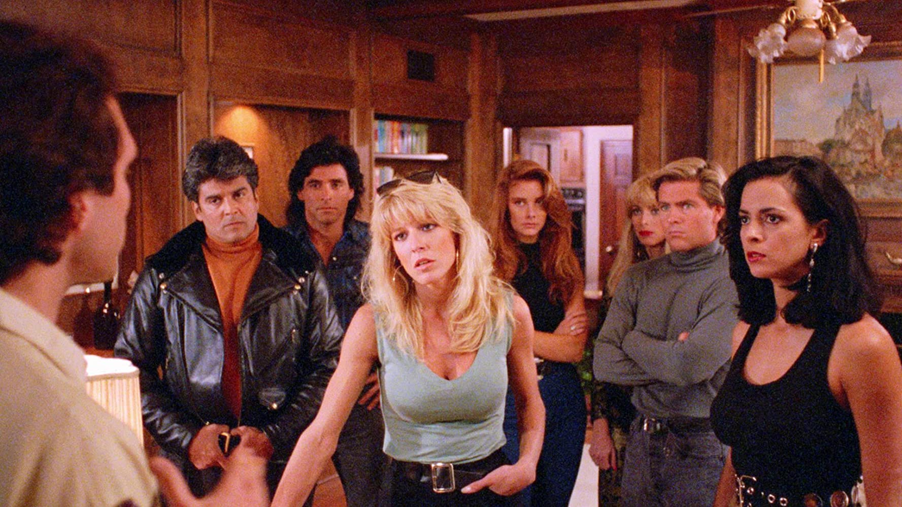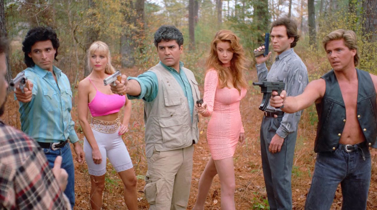 Do Or Die is significant for just how much of the usual Andy Sidaris characteristics it eschews. Instead of being set on the lush and verdant islands of Hawaii it takes place primarily in Las Vegas and the rather colorless Shreveport, L.A. For a good portion of its duration Donna and Nicole are typical damsels-in-distress instead of the pro-active, gun-toting, bikini-clad heroes they were in the prior episodes. Dona Speir is visibly tired of the role, and Roberta Vasquez, once the embodiment of South American sultriness, continues to grow more unappealing with every passing installment. Sidaris takes on the The Most Dangerous Game (1932) plot and makes the critical error of introducing far too many one-note characters that don’t add to the preceedings. Whereas Savage Beach (1989) slimmed down the cast to the barest essentials Do Or Die does the opposite and squares off 8 protagonists against 6 pairs of assassins. Of the 8 heroes only Donna and Nicole, plus Bruce Christian and Rico Esteban carry any narrative weight. Most of the assassins are played for cheap laughs, but nothing of it is particularly funny. As before Edy Stark lends more than just her voice to the movie. Making her a more active participant in the plot is one of the best decisions on Sidaris’ part, even though it initially looks like she’s going to be of no importance at all.