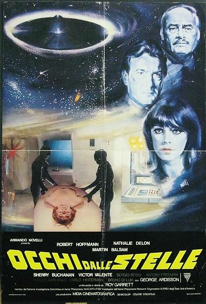 Had Eyes Behind the Stars been directed by Antonio Margheriti, Sergio Martino, or Enzo G. Castellari then it probably would have been a whole lot more lively and fast-paced. It was released in 1978 smackdab in between the still ongoing wave of foreign – and domestic Star Wars (1977) imitations and the nascent post-nuke craze following immediately in the wake of George Miller’s The Road Warrior (1981). Eyes Behind the Stars, for all intents and purposes, positions itself as a “serious movie” on the subject of UFOs, alien invasions, and government conspiracies. It makes the cardinal mistake of casting Franco Garofalo as the proxy-leading man and insists that Sherry Buchanan keeps her clothes on. Then again, Eyes Behind the Stars was produced by Armando Novelli. Novelli produced among many others, the kitschy gothic horror potboiler The Playgirls and the Vampire (1960), the giallo The Beast Kills In Cold Blood (1971) with Rosalba Neri, and a number of Fernando Di Leo movies, including his Milieu trilogy as well as a few erotic thrillers near the end of the eighties and early nineties. In a move that was bold even for late 1970s Italian exploitation standards Marcello Giombini’s score liberally plagiarized a very obvious motif from Jean-Michel Jarre’s 1976 Oxygène suite. Giombini doesn’t bother hiding his plagiarism by changing a few notes around but freely lifts the melody in its original form. In that sense it’s similar to the little seen Hong Kong-Taiwan ghost romance Ghost Of the Mirror (1974) with Brigitte Lin.
