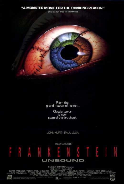 There’s no real historical precedent to explain the sudden and brief resurgence of the gothic in the nineties other than that amidst the slasher, cannibal and zombie craze of the 80s an old school ghost flick seemed more than a bit redundant. By the dawning of the new decade the slasher, cannibal and zombie subgenres themselves were on the verge of extinction – and, within context of no other subgenre having risen to the occassion of replacing them, it’s almost logical that directors would look to the past for inspiration. Considering that science fiction was having something of a revival Brian Wilson Aldiss’ Monster trilogy was a gift from the gods. Frankenstein Unbound was the first of the trilogy that also included Moreau’s Other Island (1980) and Dracula Unbound (1991). The title of Aldiss’ novel being a portmanteau of Mary Wollstonecraft Godwin’s Frankenstein, or the Modern Prometheus and Percy Bysshe Shelley’s Prometheus Unbound. Producer Thom Mount from The Mount Company had set his sights on adapting Frankenstein Unbound. Who better than the man who produced all those Edgar Allan Poe gothics? Thus he approached Roger Corman with a budget of $11.5 million ($1 million entirely for Corman), some of the hottest stars of the day and a leisurely seven weeks which to shoot it in. Frankenstein Unbound was produced in alliance with Trimark Pictures and to be distributed domestically and abroad by 20th Century Fox. Part science-fiction, part gothic horror, and all camp Frankenstein Unbound fared poor at the box office making a meager $335,000. 20th Century Fox, in their infinite wisdom, canned all sequels.