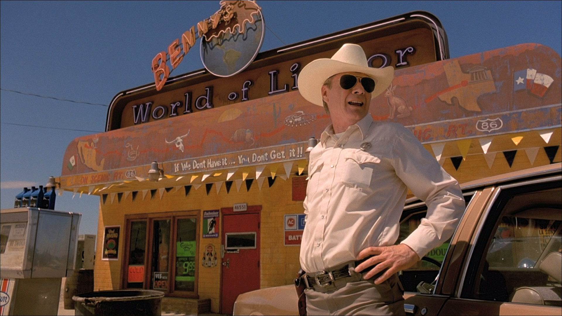 After robbing a bank in Kansas and escaping jail, Seth Gecko (George Clooney) and his slightly psychotic and deeply unwell brother Richard (Quentin Tarantino) hold up Benny's World of Liquor where they add store clerk Pete Bottoms (John Hawkes) and Texas Ranger Earl McGraw (Michael Parks) to their ever-growing list of casualties. The two are pursued by FBI Agent Stanley Chase (John Saxon) and after leaving the liquor store in flaming ruin the two head to the Mexican border with their hostage bank teller Gloria Hill (Brenda Hillhouse) in tow. They pull in at the Dew Drop Motel in Texas where they bump into the Fuller family. Jacob (Harvey Keitel) has taken his adopted son Scott (Ernest Liu) and daughter Kate (Juliette Lewis) on a vacation. Jacob is a minister in the midst of a crisis of faith after the death of his wife. Seth and Richie commandeer Jacob's RV to smuggle them across the border at gunpoint and order to take them to their rendez-vous. The minister is to take them to the Titty Twister bar where the brothers will meet their contact Carlos (Cheech Marin) at dawn providing them shelter at El Rey. Carlos figures that a bar doubling as a stripclub/brothel will offer all the necessary entertainment.