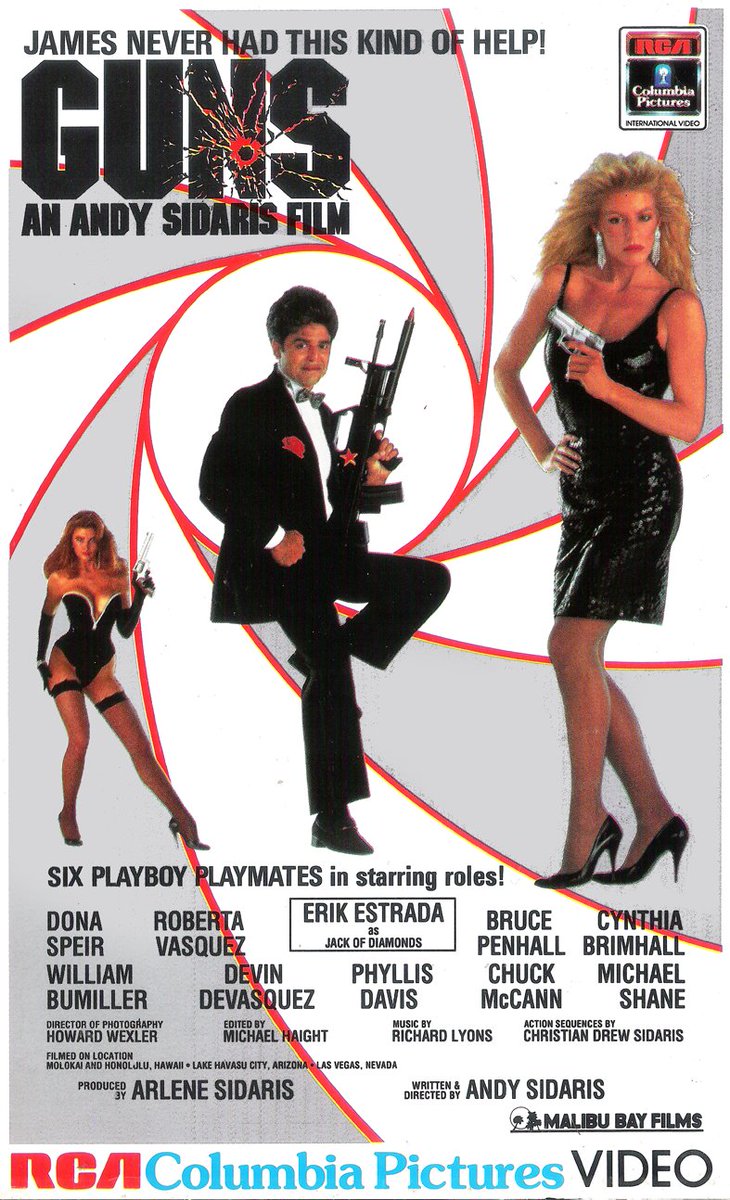 Guns is the only Sidaris production to have both CHIPs (1977) heartthrobs Erik Estrada and Bruce Penhall present at the same time. Penhall had a history with Sidaris making his first appearance as a different character in Picasso Trigger (1988) before returning four more times as Bruce Christian and staying with the series until its original end. In the interim Penhall played Chris Cannon in the two Drew Christian Sidaris entries Enemy Gold (1993) and The Dallas Connection (1994). Penhall, along with Speir and Vasquez, did not return for Day Of the Warrior (1996) and Return to Savage Beach (1996), at which point Penthouse Pets Julie Strain, Julie K. Smith and Shae Marks took over The Agency mantle. Guns signaled the exit of London and Lindeland from the series, and introduced Nicole Justin as a substitute for Taryn. Phyllis Davis and James Lew later turned up in Under Siege 2: Dark Territory (1995) as a hostage and goon, respectively.