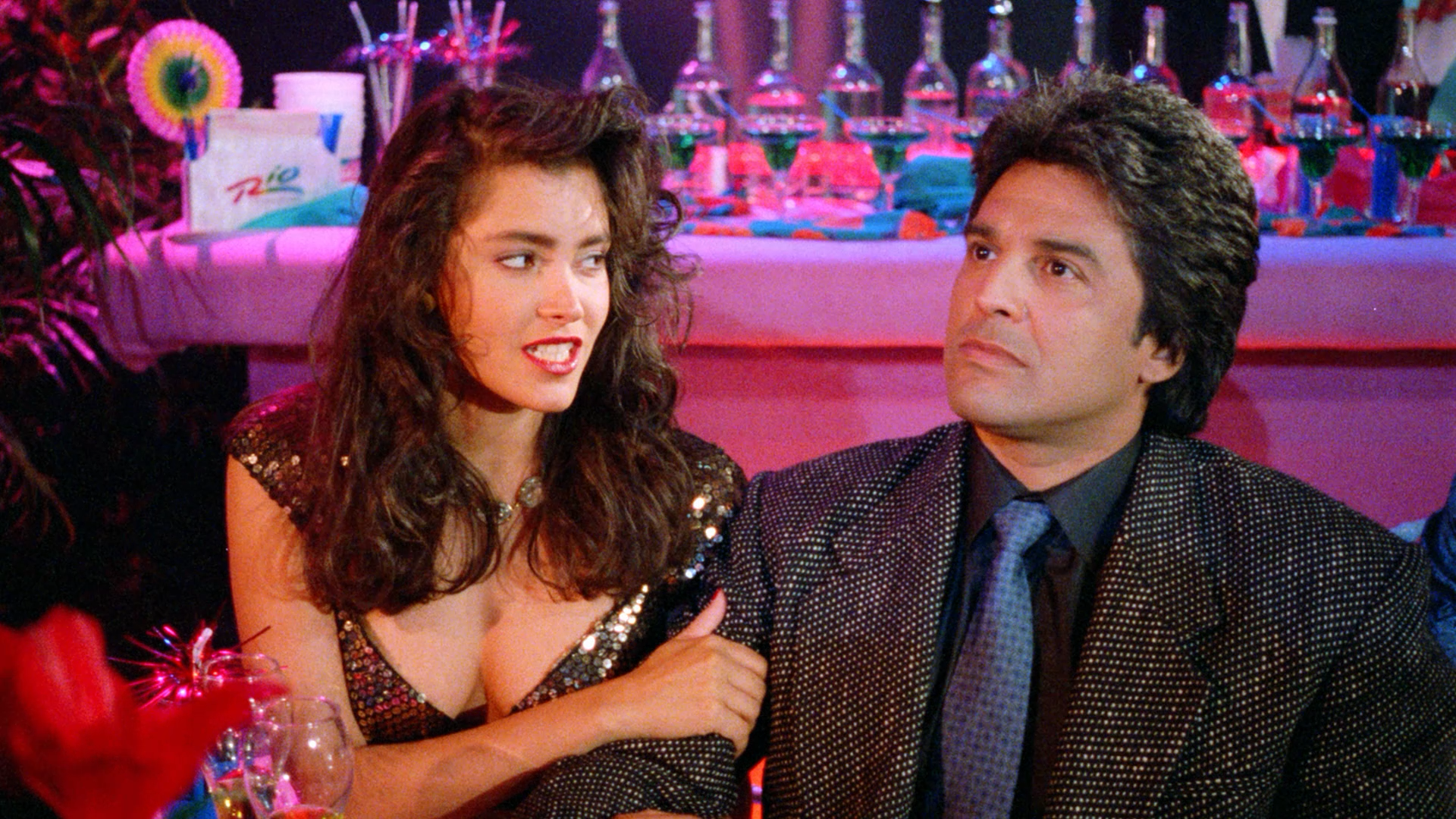 Helping Degas carry out his elaborate plan of dominating the armsdealing profession is Cash, played by Playboy Playmate Devin DeVasquez (June 1985), and Tong (Danny Trejo) and his girlfriend (Kelly Menighan). DeVasquez had appeared in House II: the Second Story (1987) and Society (1989), while Trejo’s first role of note was in Death Wish 4: The Crackdown (1987) and the Steven Seagal actioner Marked For Death (1990). It wouldn’t be until the second half of the nineties that Trejo established himself with Desperado (1995) and From Dusk till Dawn (1996). Despite fulfilling every requirement Guns is Devin DeVasquez' sole appearance in the Andy-verse. In 2009 DeVasquez married Ron Moss, or Rowdy Abilene from Hard Ticket to Hawaii (1987).