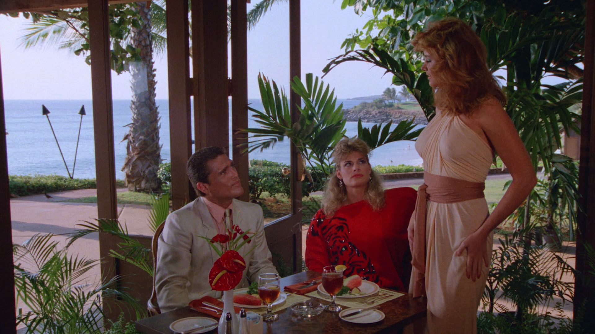 Once again Sidaris pooled talent from the same well as before. The cast is an assembly of one or two name stars, regional celebrities, humble unknowns and Playboy Playmates in lead and supporting roles. Wheras Malibu Express (1985) had Darby Hinton, famous for his turn in Filipino topless kickboxing movie Naked Fist (1981), as its name star Hard Ticket to Hawaii boasts none other than The Bold and the Beautiful (1987) heartthrob Ridge Forrester, better known as Ron Moss, who had just started playing his iconic role. The agents are played by Playboy Playmates Dona Speir (March 1984), and Hope Marie Carlton (July 1985) who, true to form, tend to fill their bras out better than their roles. Other notables are Cynthia Brimhall (October 1985) as restaurateur Edy Stark and Patty Duffek (May 1984) in a small role as Patticakes, which doesn't stop them from getting naked as often as leading ladies Donna and Taryn. Dona Speir and Hope Marie Carlton would remain with the series for several more episodes and Cynthia Brimhall would eventually be promoted to regular cast member. Sidaris would milk the formula for all it was worth, and produce another 8 loosely related sequels from 1985 to 1998. While various cast members were carried over from sequel to sequel each had its own selection of Playboy Playmates in recurring roles. Dona Speir was pretty much the series mascot during the eighties and early nineties entries of the franchise.
