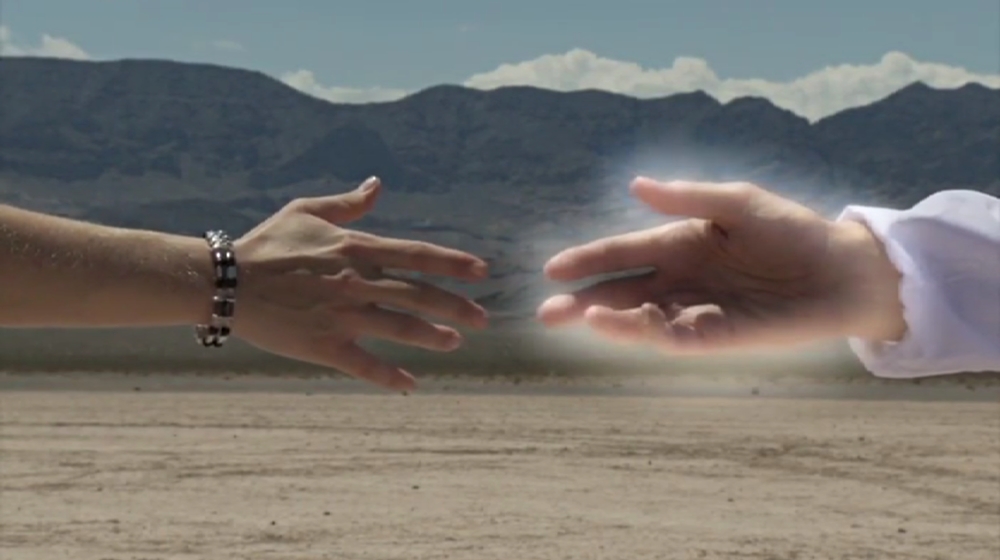 That Breen is something of a crusader and a defender of the Christian faith was evident as early as Double Down (2005). I Am Here…. Now foregoes what little subtlety (that is to say, none) the past Breen feature had, and is littered with heavy-handed, overt symbolism. To wit, it begins with Breen literally coming off a wooden cross in white robes bearing (one-sided) stigmata; early on there’s a shot of six crosses on a desert stretch, probably meant to resemble mount Calvary; The Being has regenerative powers (he restores at least two clipped roses), and occassionally performs miracles such as healing/rejuvenating the terminally ill man in the wheelchair, which was probably meant to resemble the healing at the pool of Bethesda (John 5:1-16). Less subtle (but no less overt) is the fact that Amber has angel wings tattooed on her shoulder-blades; and acts as a sort of Mary Magdalene to Breen’s Christ figure. To really drive home the point I Am Here…. Now closes with a re-enactment of the touching the hand of God from the famous Michelangelo fresco The Creation of Adam. The entire thing is wrapped in oblique Native American and New Age mysticism, and the credits include the Tuscarora Indian proverb, “Man has responsibility, not power.” It’s probably meant to insinuate that Breen is concerned about the plight of America’s indigenous peoples, but there’s no hard evidence to substantiate that assertion.
