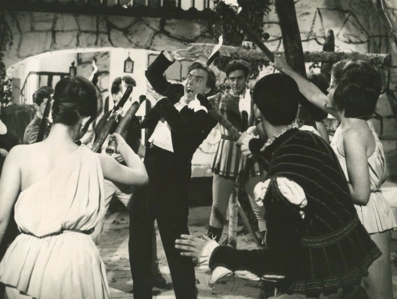 On a more interesting note it has several earlier iterations of character types that Polselli would explore in his eclectic 70s oeuvre with Rita Calderoni. This wouldn’t be a Polselli joint if old Renato didn’t push the envelope as far as he possibly could. In The Monster Of the Opera that manifests itself mostly in one scene of very strong implied lesbianism. First there’s the way Yvette is initially introduced (“born in the city of Lesbo, province of Sappho”) and later Aurora talks about the bonds of friendship between women before sharing a few longing looks with Manuela on a staircase. Then Carlotta descends the stairs and the three fall in a suggestive embrace while breaking out in laughter. Finally, Yvette enters the staircase, sternly sending the two other packing, claims Aurora for her own and the two almost share a kiss. However since it was only 1964 said kiss never materializes, and suggestion is as far as things go. What really drives most dialogues between the couples is the play with consent. Early on Rosanna tells Aldo, “you may kiss me, but don’t take advantage!”. Then later, a dance montage apart from the earlier Rosanna-Aldo exchange, Giulia reverses what Rosanna said and asks Sandro “why don’t you take advantage? Kiss me.” Quite playful and more than a progressive stance in those repressed days before the Summer of Love and Sexual Revolution.