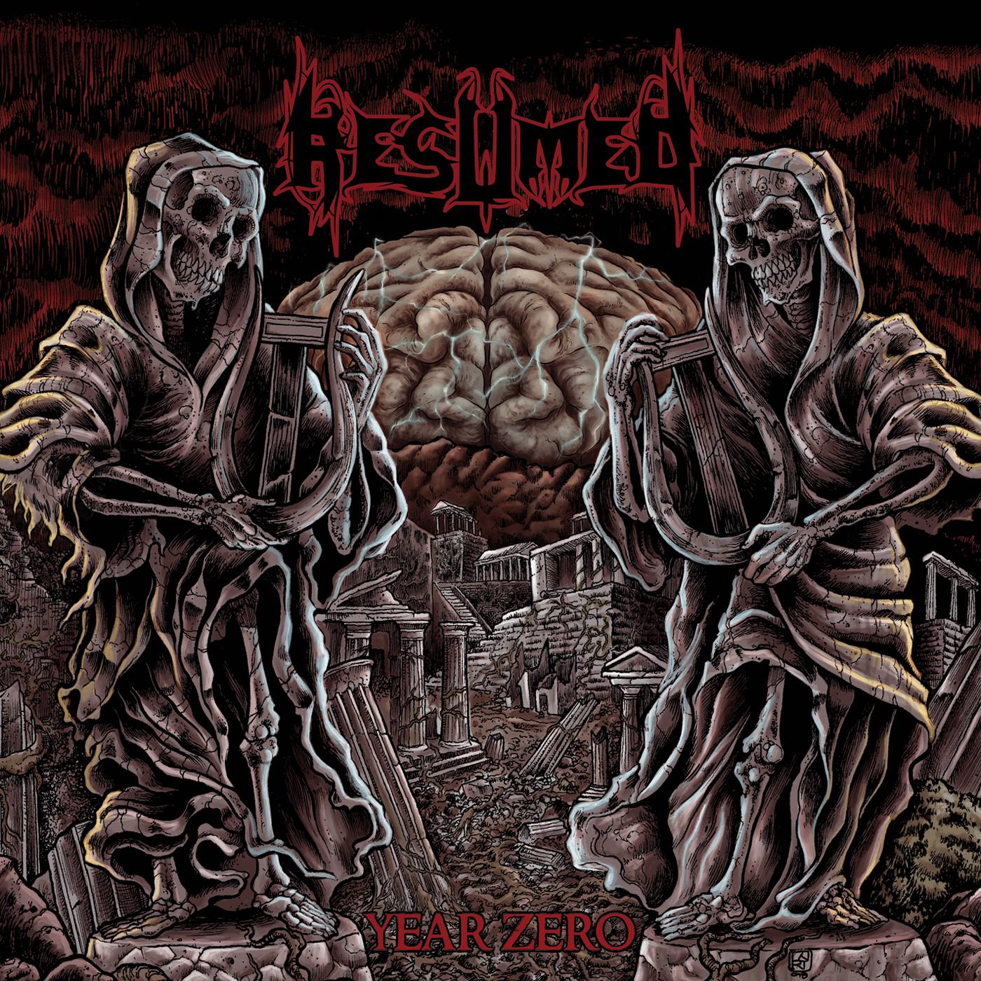 There’s no question about the indelible mark Chuck Schuldiner left on the worldwide metal scene through the work with his band Death. That the world lost one of its greatest innovators was clear even back then and even moreso now. In the ensuing decade since Schuldiner’s passing in 2001 various bands have sprung up to fill the void left by Death. The darkness of the catacombs gave the world the likes of Ekpyrosis, Ferum, and Amthrÿa (all of whom worship at the altar of Death in more primitive ways). The obvious candidate to carry on Schuldiner’s legacy is German act Obscura, now defunct Californian unit Insentient (fronted by Leslie Medina) but also Southern Italy-based Resumed. This Italian quartet debuted in 2014 with the rather unassuming but highly impressive “Alienations” and now, four years later, return on Danish label imprint Mighty Music (once home to Iniquity, among others) with “Year Zero”. Suffice to say, “Year Zero” was well worth the four-year break in between releases.