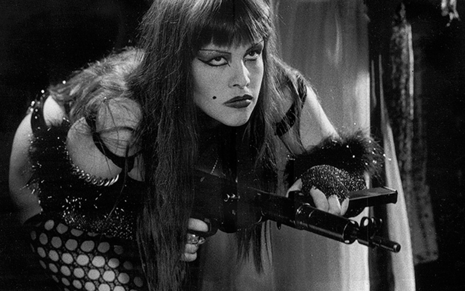 All of the women are pretty enough, although they might not appeal to those not into that whole underground punk/retro pin-up aesthetic. Admittedly, we’re no fans of some of the thicker make-up that Kerine Elkins can be seen wearing either but other than that there’s very little to complain. The biggest and obvious references on that front are Bettie Page, Jayne Mansfield and Mamie Van Doren, Wendy O. Williams, Kitten Natividad, Betty Brosmer, Uschi Digard, Monique Devereux, and Tura Satana. Or full-figured, healthy-looking women who weren’t afraid to showcase their wealthy, natural curves and whom - at least by some of today’s unrealistic and unforgiving beauty standards that seem canonize the sickly and skeletal thin above all else - would either be described as plus-size or plain fat. As near as we can tell most of the cast seem to come from either the Velvet Hammer burlesque troupe, exotic dancer, or the underground punk pool. It does raise one question: why were the Julies, the late great Strain and K. Smith, not in this? Superstarlet AD was something right in their wheelhouse, boudoir, or lingerie closet rather. Strain had taken her top off for lesser filmmakers and on scanter budgets in those unrewarding post-Sidaris years. Those who love vintage lingerie will get an absolute kick out of Superstarlet AD as these gun-toting belles brandish more than enough stockings, garter belts, suspenders and such to satiate anyone’s craving. With that in mind, this is probably the greatest monochrome post-apocalyptic sci-fi Andy Sidaris and Jim Wynorski never made