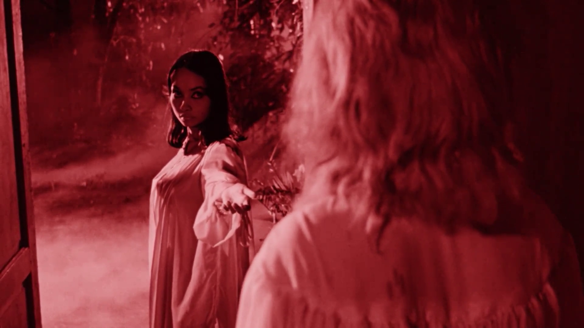 In age-old gothic horror tradition The Blood Drinkers is a morality play on good and evil and a very Catholic one at that. If the heavy-handed narration doesn’t make it clear, the continual religious iconography certainly will (or should). What this most resembles is a very loose retelling of Bram Stoker’s Dracula. The main plot recreates most of the key events and each lead character has a book counterpart and is true to their respective arc. Dr. Marco is Count Dracula, Charito and Katrina are Elisabeta and Mina Murray Harker, Victor de la Cruz and Ruben are Jonathan Harker, Tanya and Doña Marissa are R. M. Renfield, and the priest as Professor Abraham Van Helsing. The Living Corpse (1967) from director Khwaja Sarfraz did the unlicensed adaptation thing a lot smoother than de León and Cesar Amigo do here. The Living Corpse (1967) is even more impressive considering it was made in Pakistan. More than anything the color scheme is what ensured this its cinematic longevity. Since color stock was in short supply in the Philippines and thus too expensive to use carelessly The Blood Drinkers was shot alternately in color and black-and-white (later tinted in hues of blue, pink, red, magenta). Not only does this color-coding greatly enhance the atmosphere, it actually has a contextual function. Whenever Marco appears - or whenever the vampires prey on their victims and dread rises - the screen will be painted red (characters will even break the fourth wall and exclaim “It’s all red!”), suspenseful scenes are dyed in blue with pink and magenta appearing for the character scenes in between. There are scenes in color, but they are far and few, and headscratchingly random. A harana ensemble has an entire dedicated color segment for their nightside courtship serenade, a young maiden is exsanguinated in the jungle by Marco but the kill is not in color whereas the immediate aftermath is. It truly boggles the mind. The score from Tito Arevalo is suitably bombastic, portentious, and creaky. Oh yeah, there’s even a rubber bat on a string that the American distributors loved. As always, the original Tagalog version (with subtitles) is preferable but the edited international English-language version is charming in its own dim-witted American way.