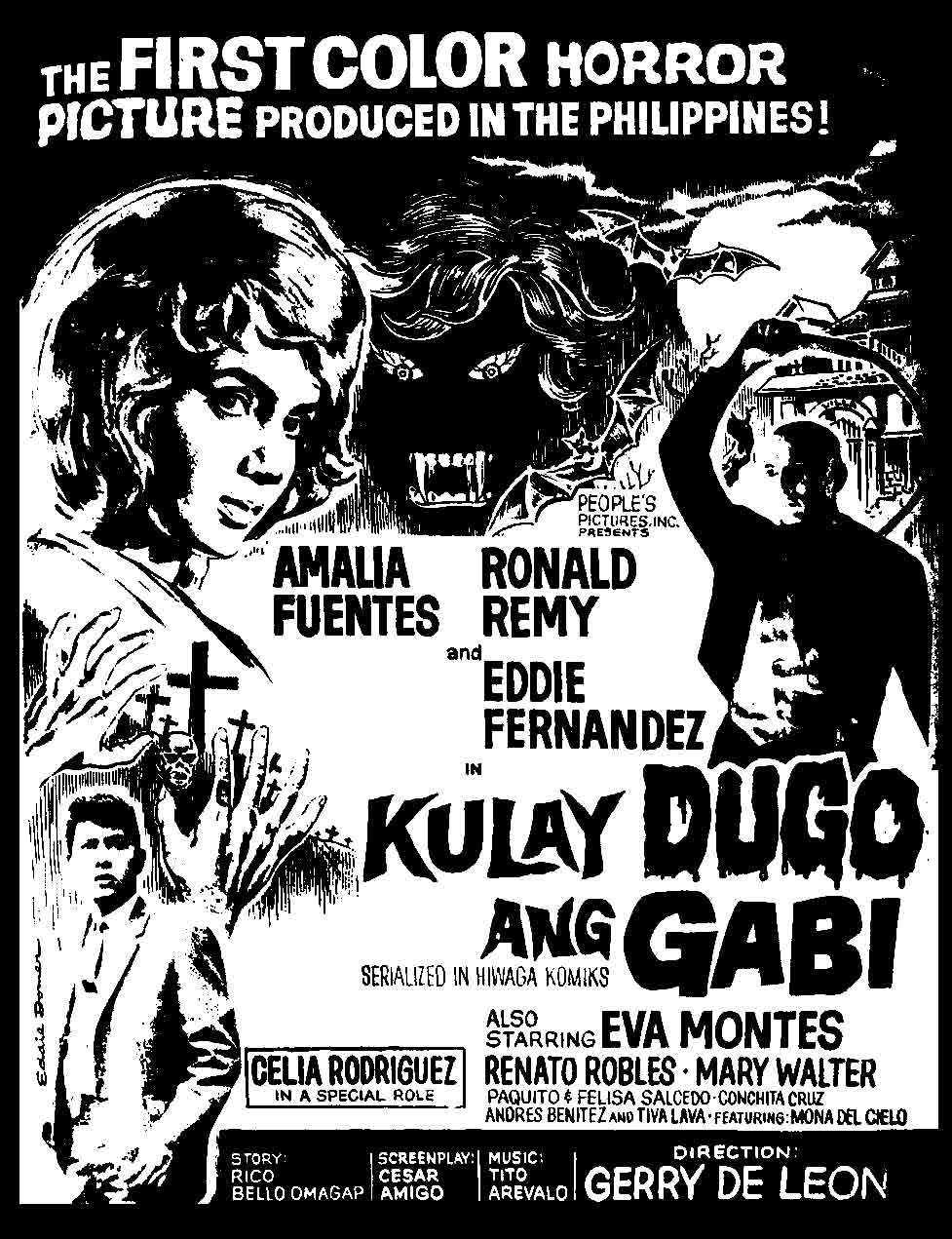 Kulay dugo ang gabi (The Night Is the Color of Blood or Blood Is the Color of Night, Google Translate insists on the former, the cult blogosphere at large on the latter. Regardless, it was released internationally as The Blood Drinkers and, for a later reissue, The Vampire People) influenced by Universal horror films and the Hammer horrors of the day and, more importantly perhaps, is historic for being "the first color horror picture produced in the Philippines.” It was based on a serial komik (which one is a mystery to us at this point) from Hiwaga Komiks by Rico Bello Omagap and illustrator Jim Fernandez. Directed by Gerardo de León, produced by the Filipino Roger Corman, Cirio H. Santiago with his Premiere Productions in association with AM Productions for Hemisphere Pictures; The Blood Drinkers is a pompous partially in color gothic horror with that undeniable Southeast Asian flavour and an all-star cast including Ronald Remy, Amalia Fuentes, and Celia Rodriguez. The Blood Drinkers might very well be the first Filipino vampire horror and is alternatively delightfully old-fashioned or completely campy. Before the Blood Island saga brought Filipino madness to grindhouses around the world, there was The Blood Drinkers.