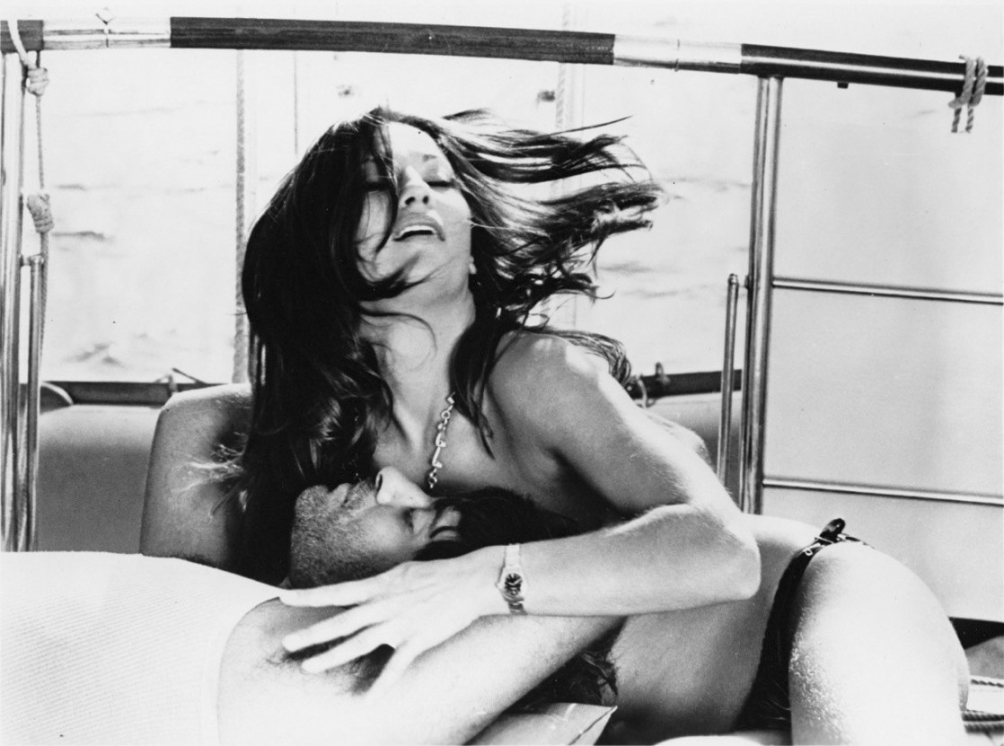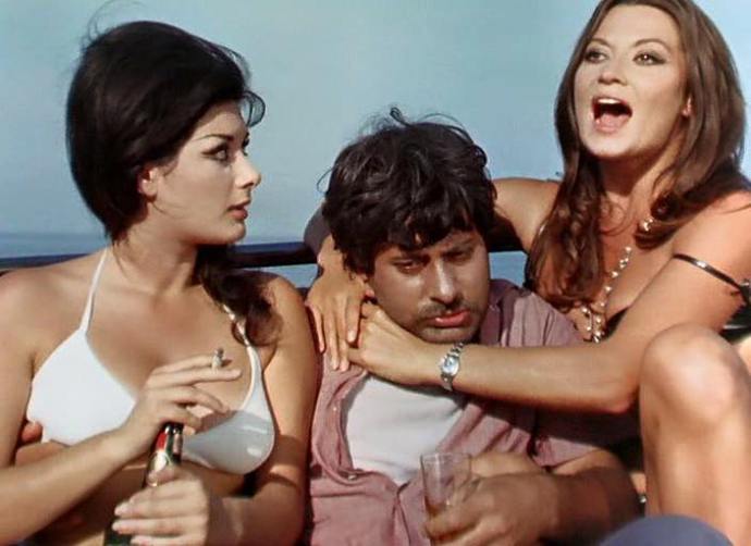 Rosalba Neri and Edwige Fenech spent most of their screentime in the skimpiest of bikinis, and about as much time out of them. Both women are highly sexual, and completely sexualized. In its defense at least Top Sensation makes no qualms or excuses about the fact. Early on Paola and Ulla notice Andro spying on them from the foliage. “God, I wish he'd move into the open more,” Ulla muses, “he ought to be hard by now” Paola notes in a near-porn exchange. The two girls lure him out by taking their tops off and oiling each other on the deck with sunscreen. When the boat first experiences trouble, Tony disappears and is seen on the nearest island. Aldo and Ulla volunteer to search the shore and return the young boy. At one point Ulla, wearing nothing more than a captain’s hat and a white shirt, runs into a wandering goat nearby Beba’s farm, something which greatly excites her. Aroused by the farm animal she spills out her left breast - which the goat happily indulges in suckling with reckless abandon - as the goat makes its way down she allows herself to be orally pleasured by the animal. Aldo, enthused at the shore-bound vista, wastes no time in documenting the salacious happening with a photocamera he brought along for the trip. Later on the boat Paola and Ulla ravage Beba by feeding her alcohol, and the two are only stopped when Mudy barges in on the lower deck.