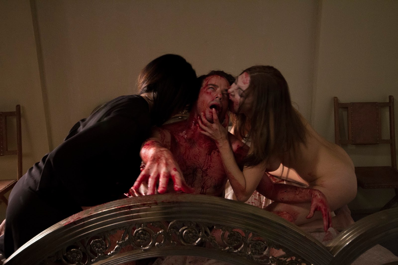 The next night Fran and Miriam bring in another victim to exsanguinate. When they are done with him they discover Ted locked in the cellar, and their weakened guest doesn’t mind the prospect of a potential threesome, even if the two women end up draining him of more than just his seed. After they’re finished with him and he’s in a dazed and confused state of phlebotomized stupor, Fran and Miriam feast on each other. Harriet has experienced going-ons at the mansion, mostly in the form of a mysterious scythe-wielding man (Antonio Mayans) skulking the environs, and decides to investigate. Her curiosity leads to her to mausoleum beneath the mansion, and the crypts wherein Fran and Miriam reside during the day. John returns from his morning excursion to find Harriet investigating the mansion, and leads her back to their tent moments before she’s bound to find the captive Ted. Fran and Miriam surmise that Harriet and John are posing too much of a threat and zone in on them. It might just be enough for Ted to plan his escape. The morning after his escape Ted is woken up by a real estate agent (Hilda Fuchs) and a senior couple (Conrado San Martín and May Heatherly) and learns that the mansion has been abandoned for decades.